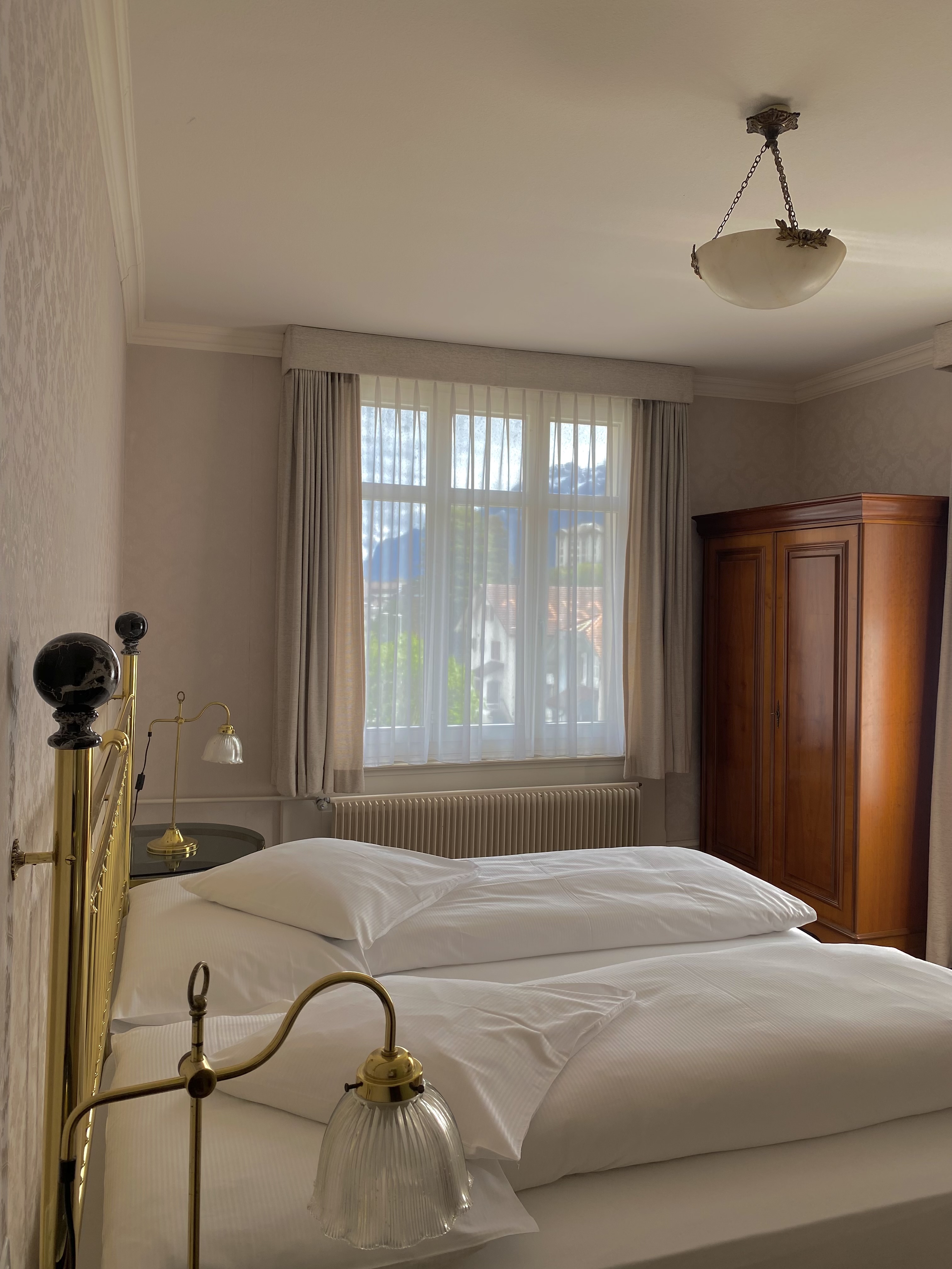 This is our small and cosy double room on our top 4th floor with ensuite bathroom. The room has low ceiling as it is in the attic. The lift take's you to floor 3 then by stairs to the 4th floor. The room has 1 small double bed, TV, water kettle, table fan and beautiful view.